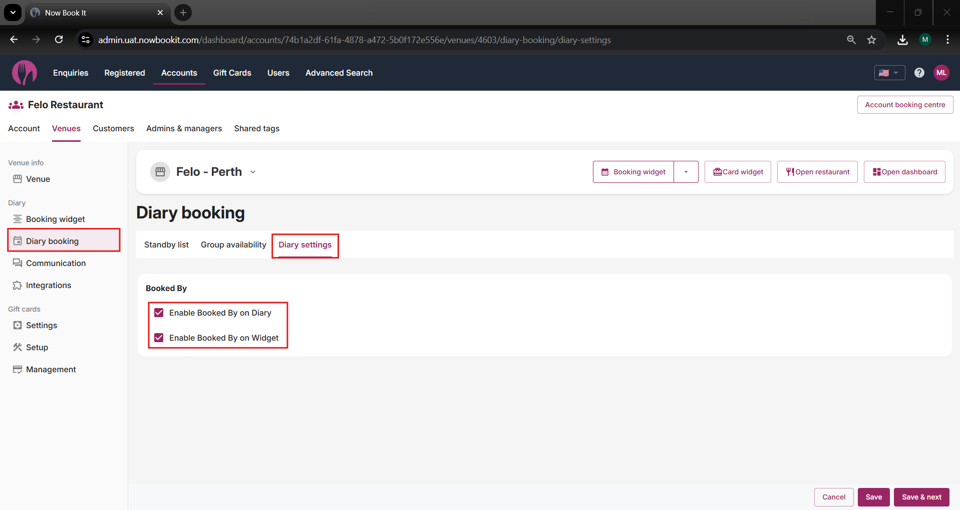 - Check the boxes for Booked By in the Diary and Booked By in the Widget
