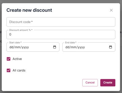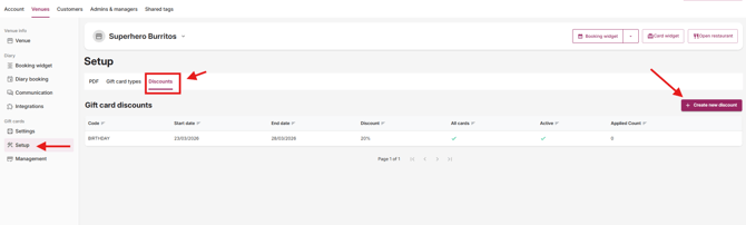 In this area, you can create a discount code that customers can apply at checkout when the venue is running a gift card promotion.
