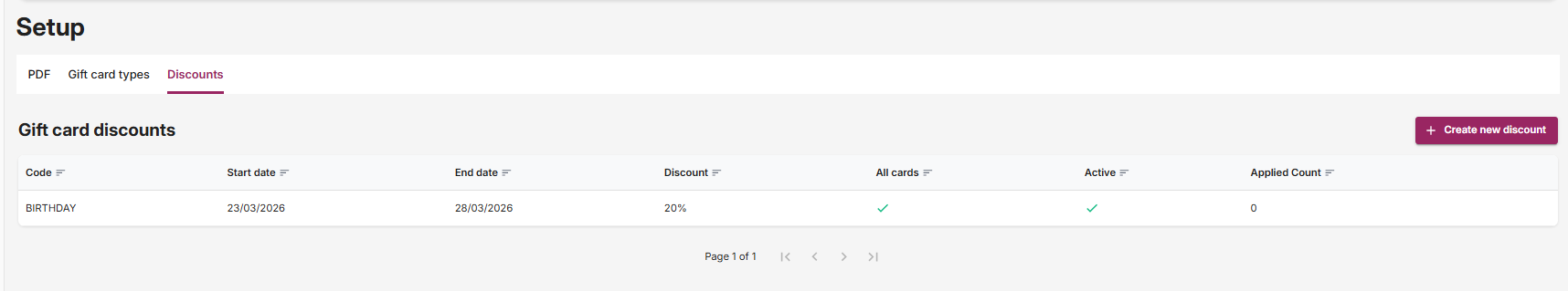 - Select Setup under Gift cards on the left hand side of the Admin Panel. The following window will appear: