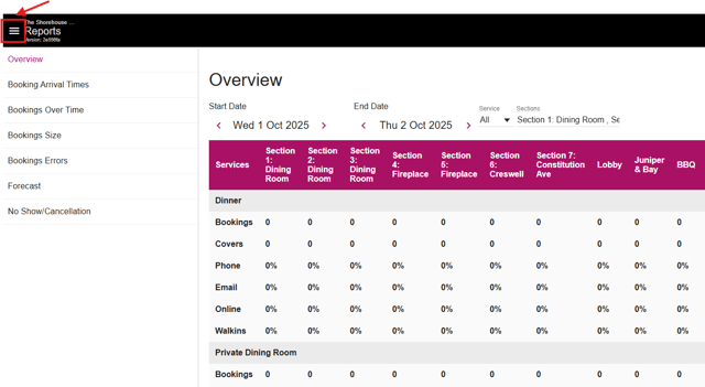 The Overview Report provides a summary of bookings vs covers, including how the booking was made (phone, email, online, or walk-in). It also breaks bookings down by the section of the venue they’re allocated to.