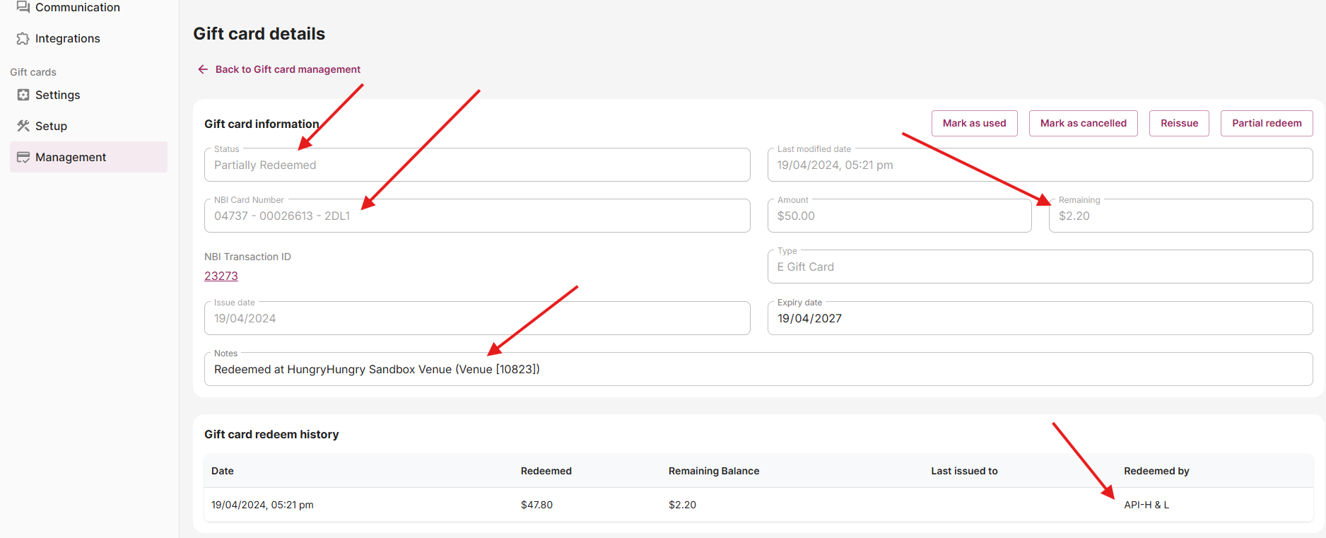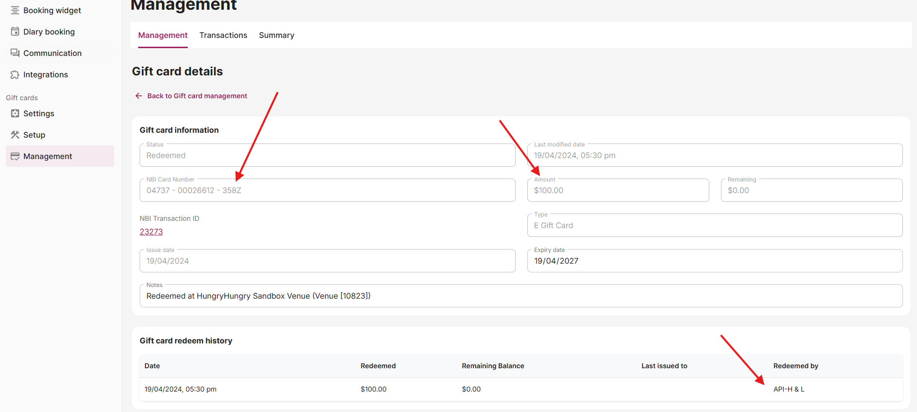 Transaction details are sent in real-time and stored in the Now Book It gift card management portal.