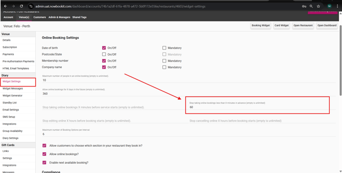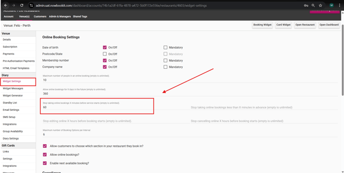 This setting affects all services. For example, if your venue has breakfast, lunch, and dinner, entering 60 minutes here will prevent online bookings 60 minutes before and during each service.
