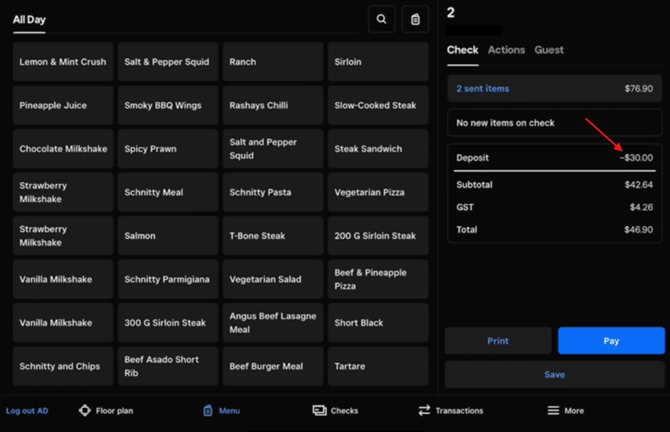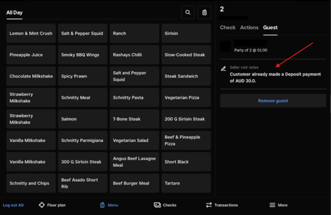 ‘Guest’ tab will show table pax, NBI Tags, Booking Notes, and if a pre-payment or deposit has been made