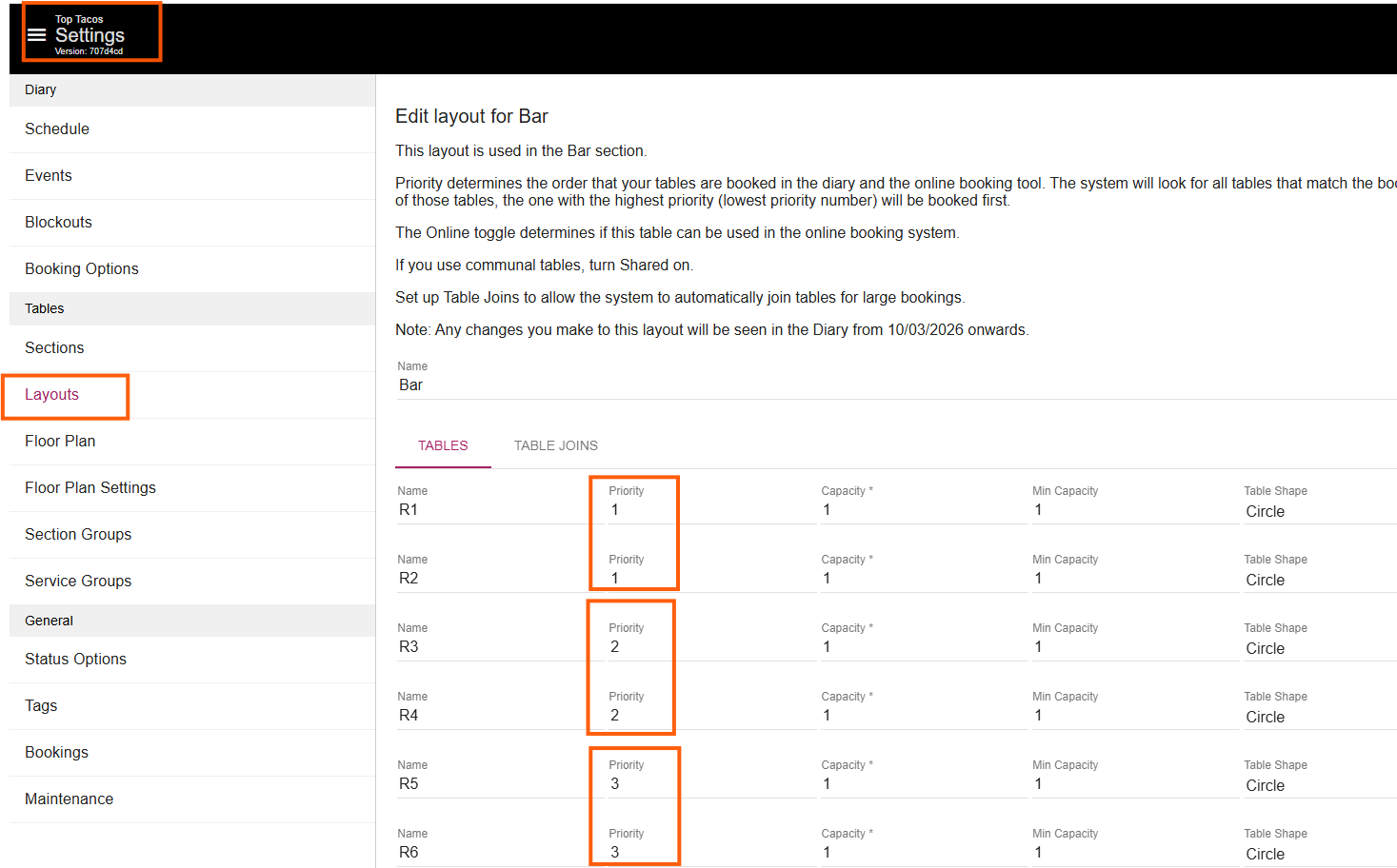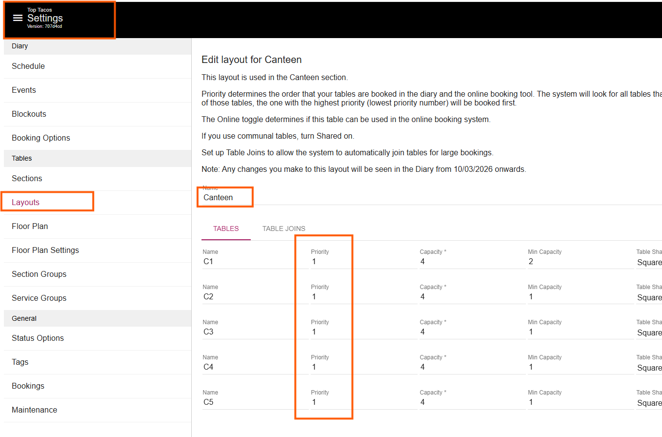 Table priorities determine the order in which tables are allocated for bookings through both the Diary and the online booking widget.